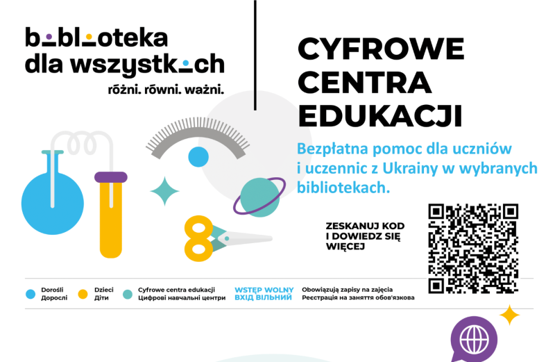 W ramach programu “Biblioteka dla wszystkich. Różni. Równi. Ważni.” w bibliotekach uczestniczących w projekcie powstają Cyfrowe Centra Edukacji, w których uczniowie i uczennice z Ukrainy otrzymają wsparcie w nauce ukraińskiej i polskiej podstawy programowej. Biblioteki wyposażone są w potrzebny sprzęt i materiały edukacyjne, a do pomocy dzieciom zatrudnieni są nauczyciele mówiący po ukraińsku. CCE mają na celu wsparcie edukacji i integracji dzieci oraz przeciwdziałanie wykluczeniu. Zajęcia w Bibliotece Miejskiej w Ustce rozpoczynają się 22 września. Wsparcie udzielane będzie w czwartki w godz. 13.30-16.30, w piątki w godz. 14.30-17.30 i w soboty w godz. 10.00-14.00.