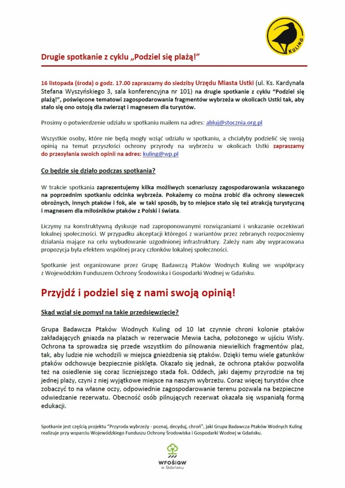 na drugie spotkanie z cyklu “Podziel się plażą!”, poświęcone tematowi zagospodarowania fragmentów wybrzeża w okolicach Ustki tak, aby stało się ono ostoją dla zwierząt i magnesem dla turystów.